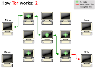 A figura abaixo mostra de forma básica como os dados fluem da origem (Alice) para o destino (Bob). A comunicação é realizada por três nós (servidores de relay), escolhidos randomicamente. Note que a comunicação flui criptografada na maior parte da rota.