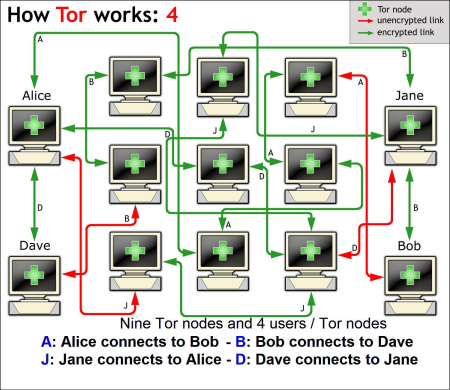A figura abaixo mostra de forma básica como os dados fluem da origem (Alice) para o destino (Bob). A comunicação é realizada por três nós (servidores de relay), escolhidos randomicamente. Note que a comunicação flui criptografada na maior parte da rota.